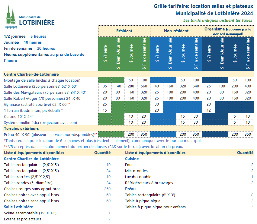 Les tarifs 2023 sont maintenus en 2024. Pour plus de renseignements sur les salles offertes en location, communiquez avec nous au 418 796-2103 ou à l'adresse [email protected]. Toute location doit être faite au moins 72h d'avance.